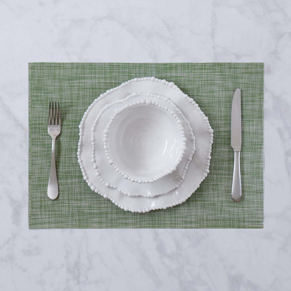 A fresh idea! Beatriz Ball's VIDA Rectangular Woven Placemats Set of 4 (Green) will give any table an instant makeover with lively pops of color, pattern, and texture. Sold in sets of four, this dynamic design in a springtime green has the look of a handloomed piece, but with the durability and carefree quality you'll love. Generously sized for a handsome look on your table. Pair them with our Easy Peasy napkins for a great addition. Easy care, wash with soap and water. Made of eco-friendly, high quality, environmentally safe PVC. Phthalate free.