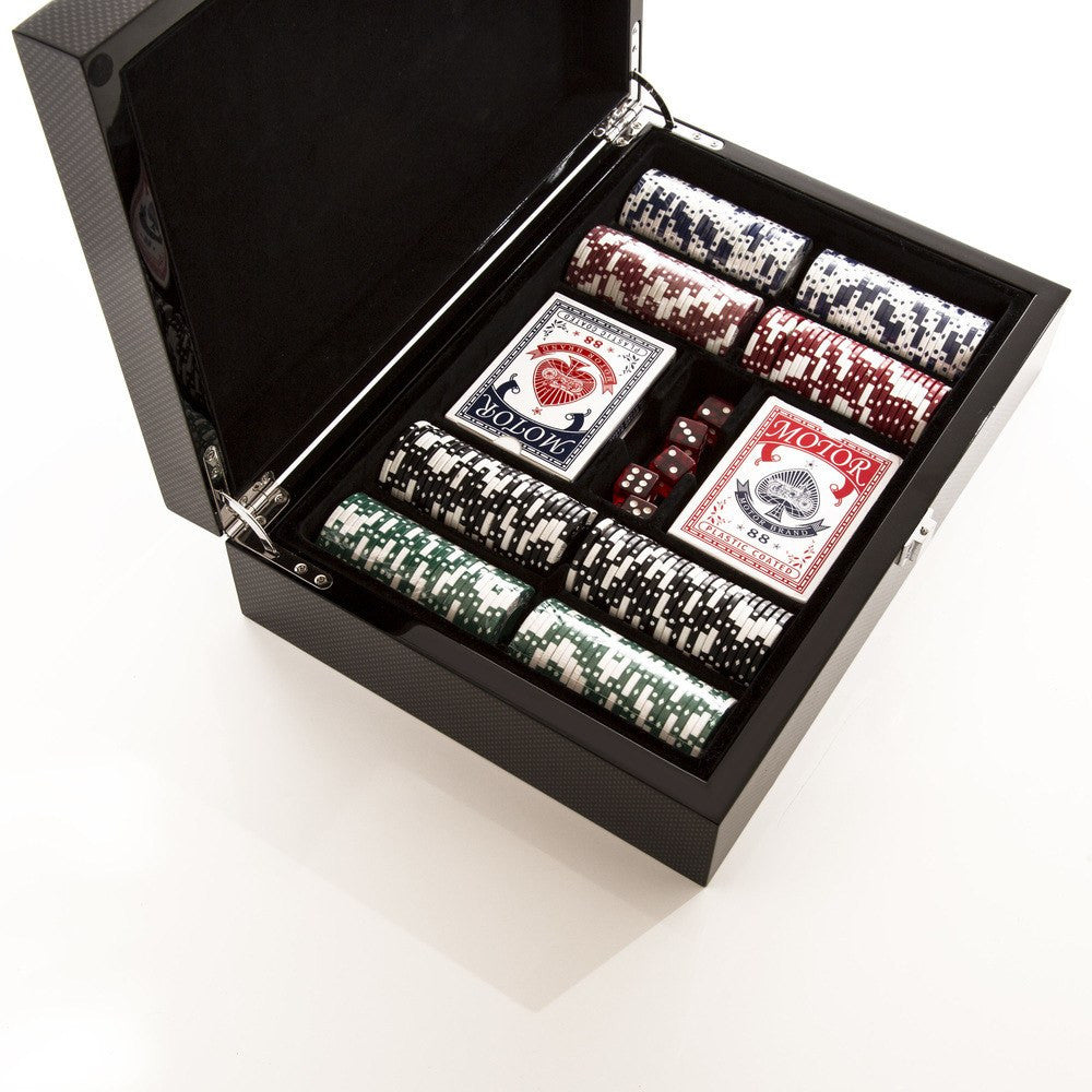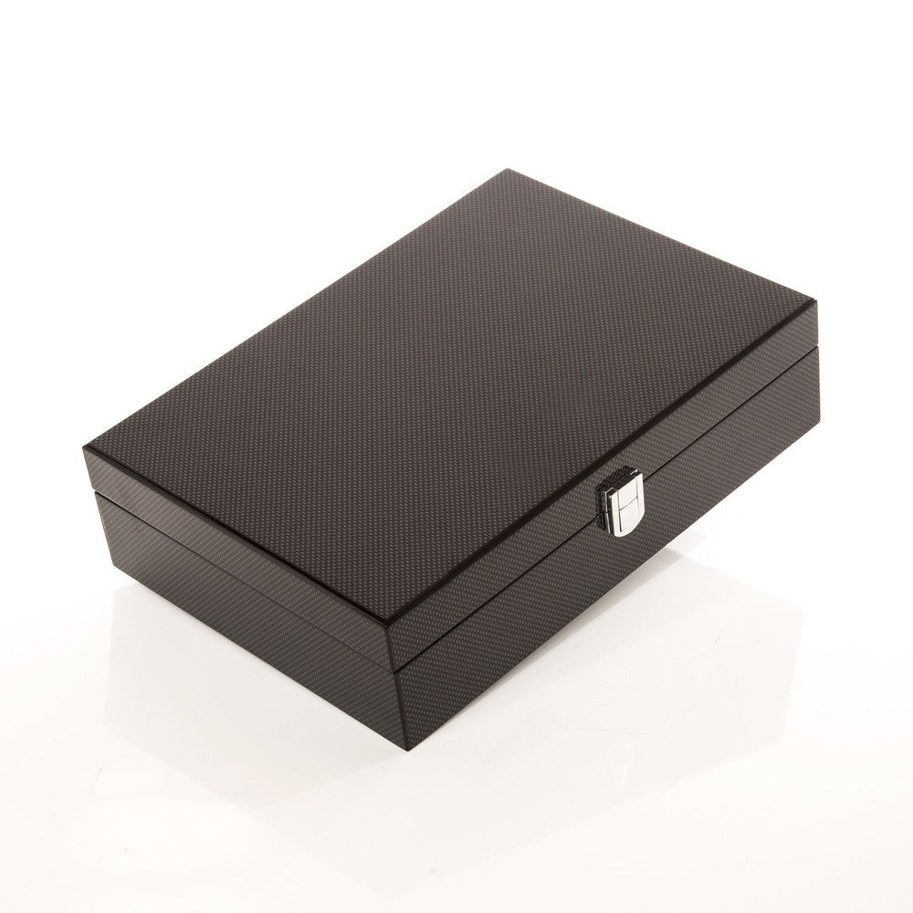 Our game collection featured in a contemporary carbon fiber case. Choose from 15" backgammon set, dual playin card case, 100 chip poker box, 200 chip poker box and domino set. Add to your collection in this custom full carbon fiber case with black velvet lining. Features high gloss wood box with carbon fiber finish for dice, chips, or domino pieces, all in velvet lined game base.