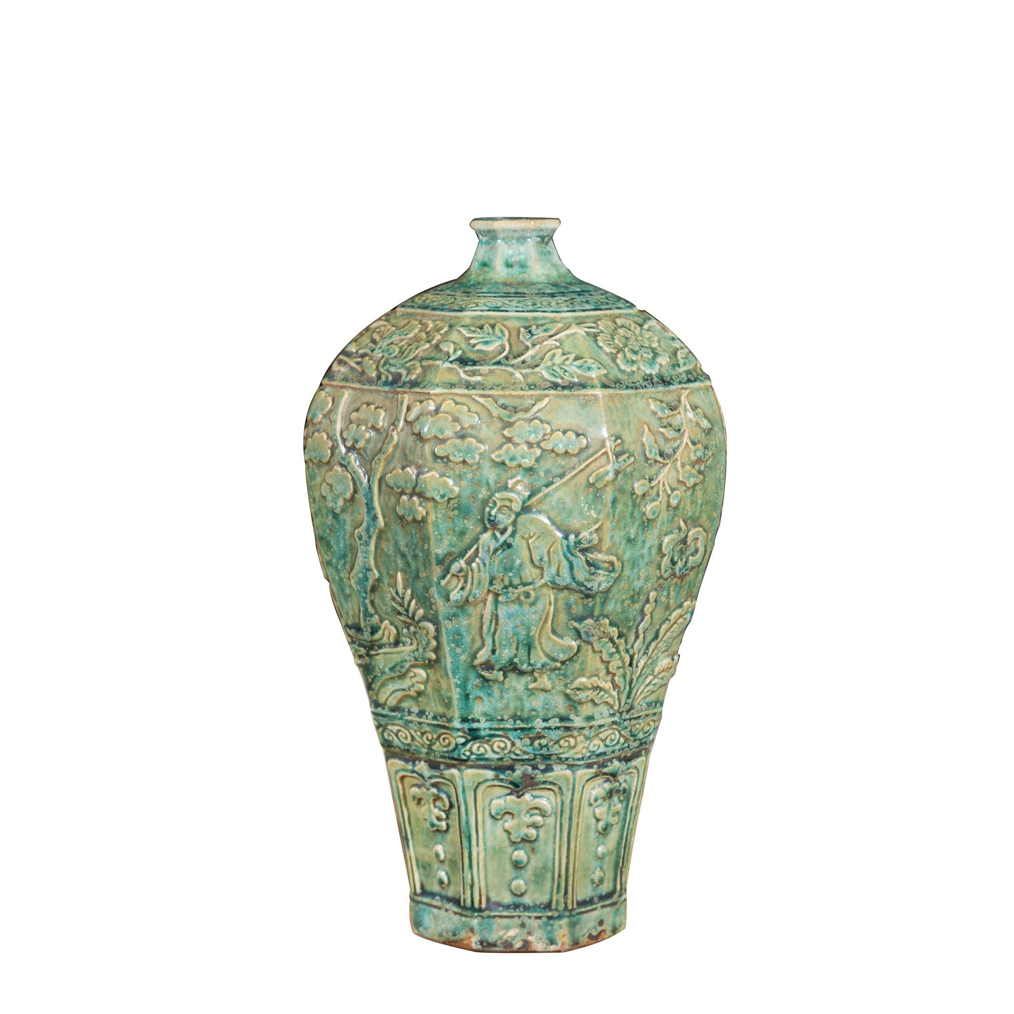 Legend of Asia Speckled Green Carved People Octagonal Plum Vase