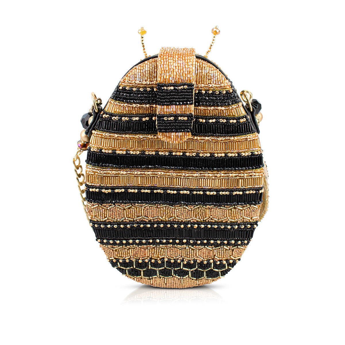 Buzz into style with this sparkling bee shaped bag, detailed with golden stripes, jeweled wings, and a sweet floral accent. Finished with a chain strap, it’s perfect to wear crossbody or carry as a statement clutch.