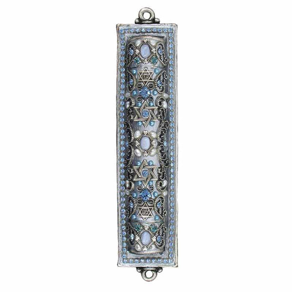 Light blue crystals and silver enamel give this mezuzah a sophisticated look, a great piece that won™t clash with other home furnishings. This freshwater pearl and Star of David embedded piece is a great way to bring your Jewish faith into your home!