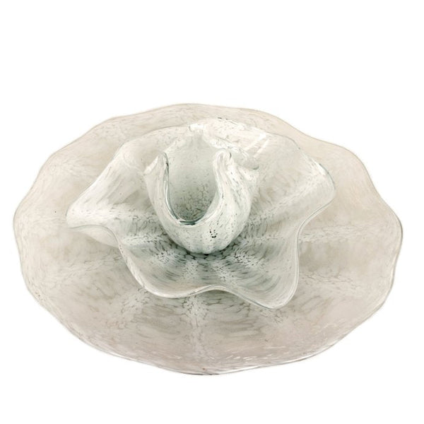 Speckled White Poppy Flower uses Natura Hardware to Mount on Wall or Ceiling. Three hand blown plates, each one had a hole in the center so that they can be staked on the hardware that will hold the glass in place. A small 1” round satin nickel cap will be visible in the center of the plate but it is mostly obscured by the cup-like section of glass.
