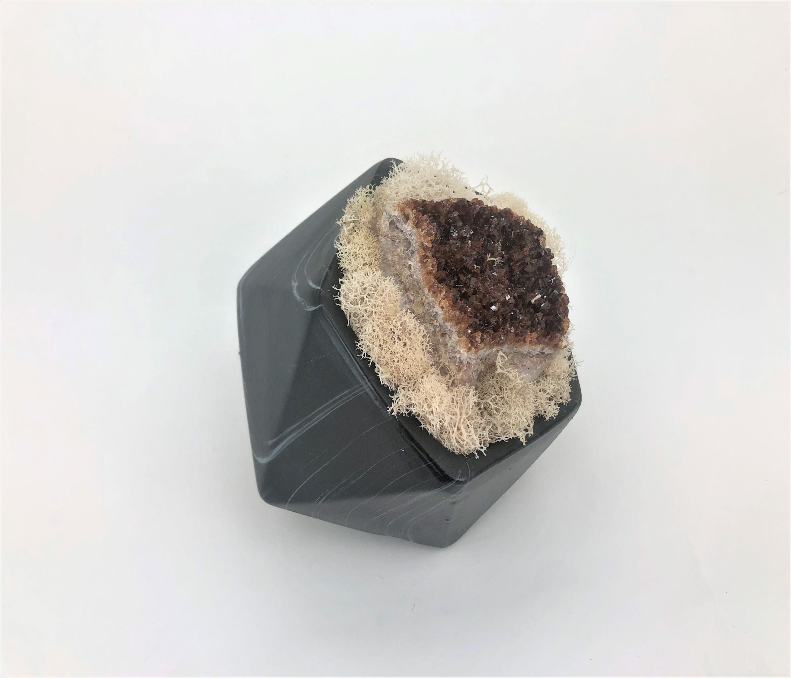 Black Marble like container multi faced filled w/preserved moss and Citrine