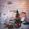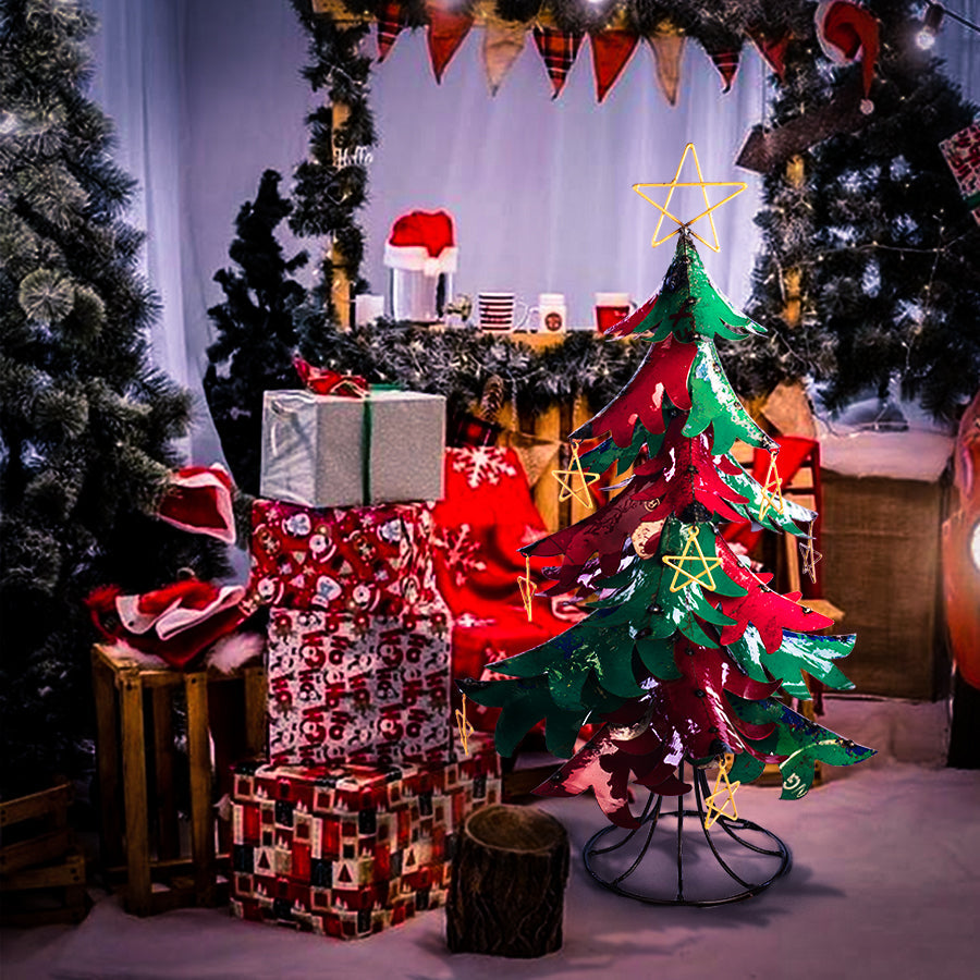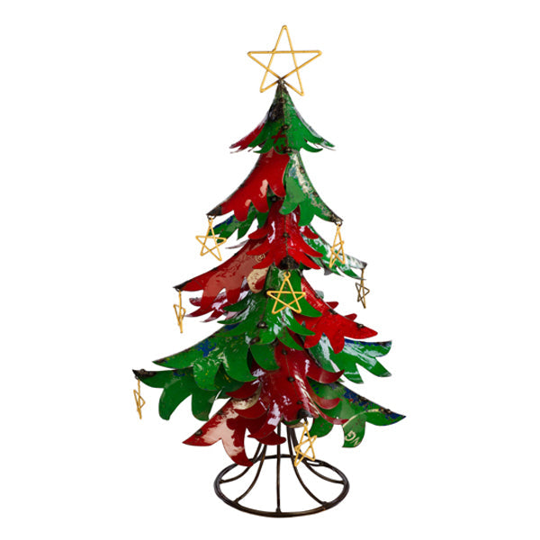This colorful sculpture is the perfect addition to your Christmas decorations. Made from recycled metal, this handcrafted piece is not only visually stunning but also eco-friendly. The sculpture depicts a charming Christmas pine tree, complete with textured branches and a star on top. The tree's multi-colored finish adds a festive touch, making it an eye-catching focal point in any room. Add some holiday cheer to your home with this unique and beautiful piece of art.