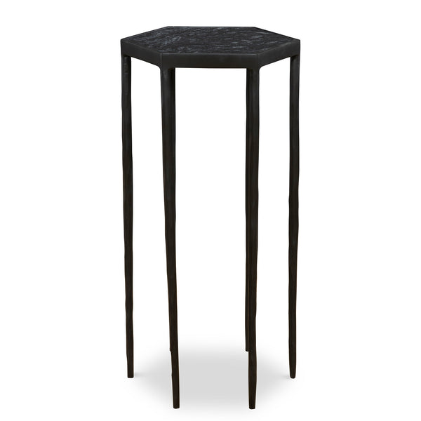 This Striking Hexagonal Table Features A Chiseled Iron Base Finished In Satin Black Paired With A Honed Black Marble Top With Natural White Veining. Because Of The Natural Characteristics Of Marble, Each Piece Will Have Unique Veining Patterns.