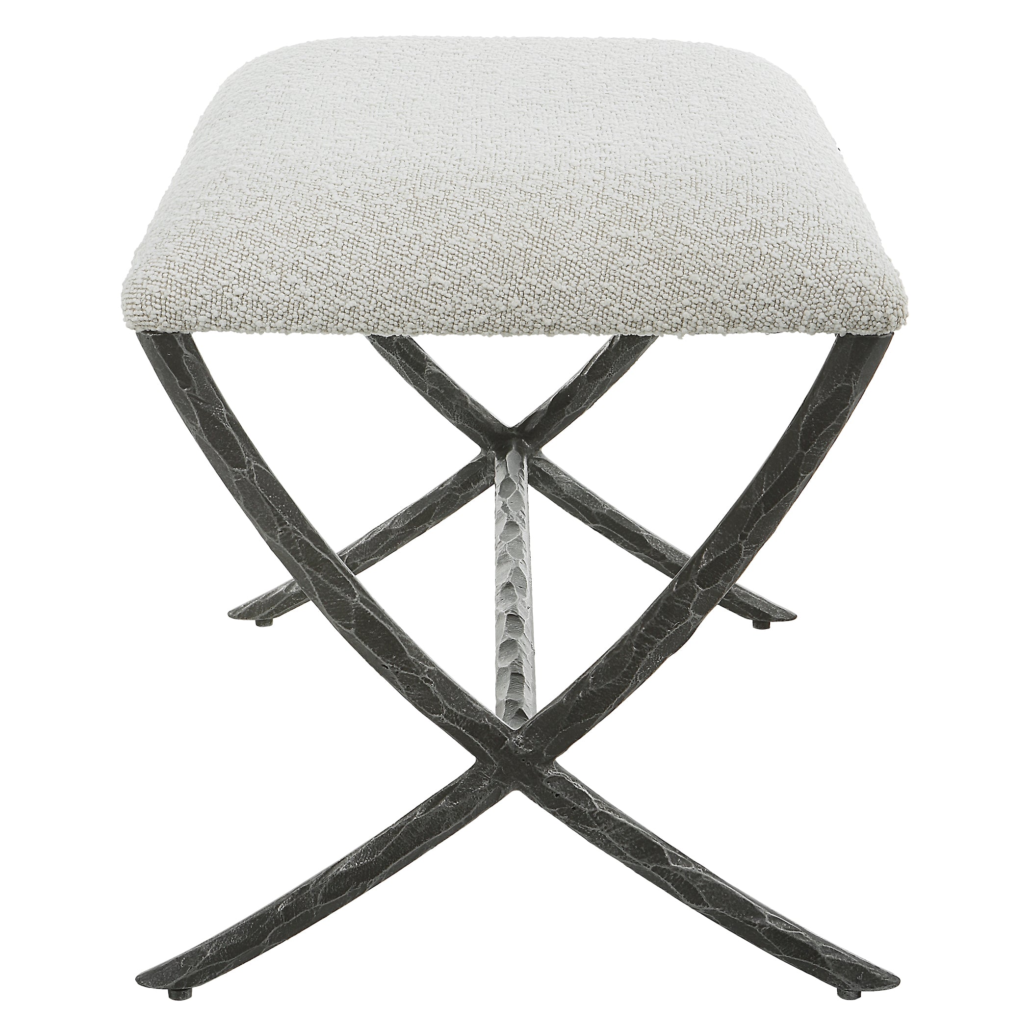 With Clean Contemporary Lines, This Cast Iron Base Features A Chiseled Texturing With A Distressed Charcoal Finish. Topped With An Upholstered Seat In A Casual Ivory And Warm Gray Boucle Fabric.