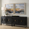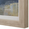 The Dusk Framed Prints Are An Abstract Depiction Of The Sun Setting On A Scenic Mountain Ridge, Highlighting Shades Of Dusty Peach And Prussian Blue. A Natural Wood Grain Frame Surrounds Each Print And Is Accented By A White Linen Liner. Artwork By Silvia Vassileva.