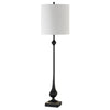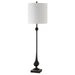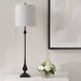 This Updated Traditional Buffet Lamp Is Finished In Satin Black With A Luxurious Velvet-like Texture That Exudes Sophistication And Contemporary Elegance, Displayed On A Sleek Black Marble Foot, Accented With Plated Antique Brass Details. The Round Hardback Drum Shade Is Covered In A Crisp White Linen Fabric.