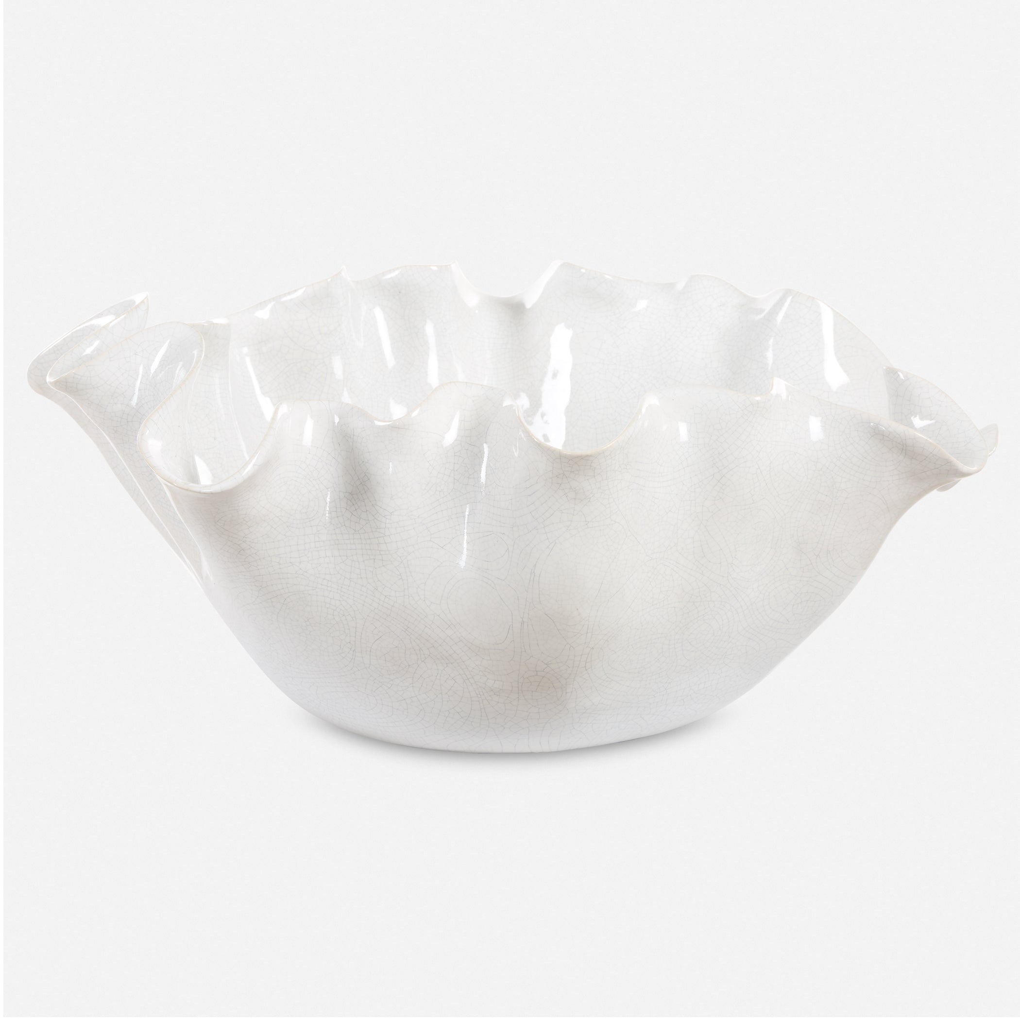 This Elegant Ceramic Bowl Features A Stunning Ruffled Edge Design, Evoking The Delicate Shape Of A Blooming Flower. Its Soft White Glaze With A Subtle Crackle Finish Adds Texture And Sophistication, Making It An Ideal Statement Piece For Any Modern Or Classic Decor. Perfect For Displaying As A Centerpiece Or For Functional Use, This Bowl Blends Art And Practicality Effortlessly.Size (DxWxH"): 14 x 15.5 x 7 Designer: Matthew Williams